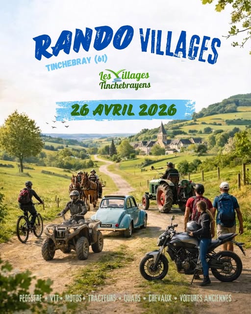 La rando-villages multi disciplines est de retour le dimanche 26 avril 2026 à Tinchebray ! À pied, en VTT, en enduro, en quad, en moto de route, en attelages, en tracteurs anciens ou en voitures de collection… il y en a pour tous ! Circuits différents (tracé et distance en fonction de la discipline). Repas midi compris dans le tarif.